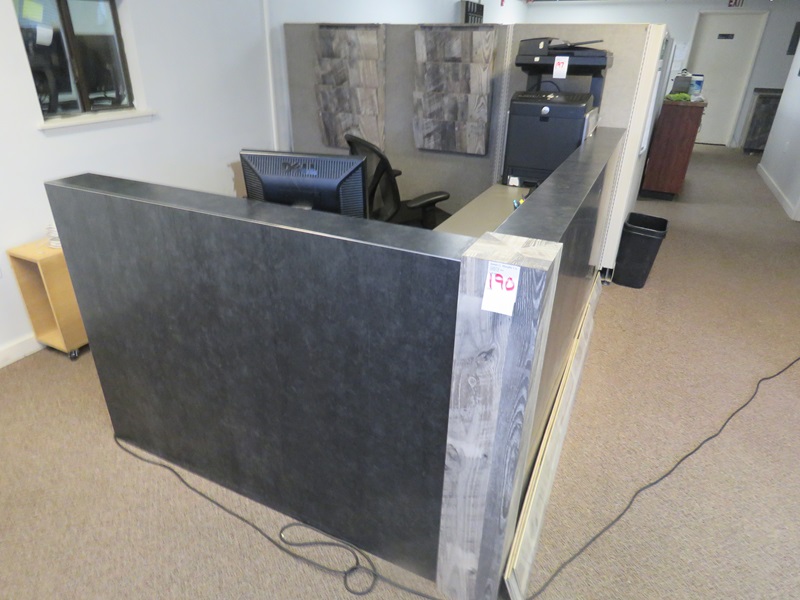8' X 5' L-SHAPED RECEPTION DESK W/DECORATIVE WOOD TRIM (DOES NOT INCLUDE COMPUTERS OR PRINTER, MATCHES LOTS 190 & 192)