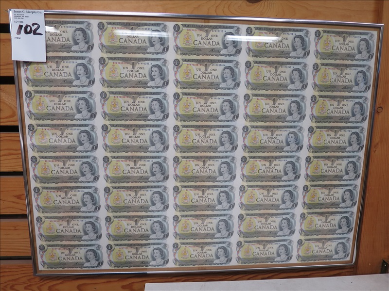 SHEET OF (40) UNCUT 1973 CANADIAN $1 BILLS, FRAMED 31"W X 23"H