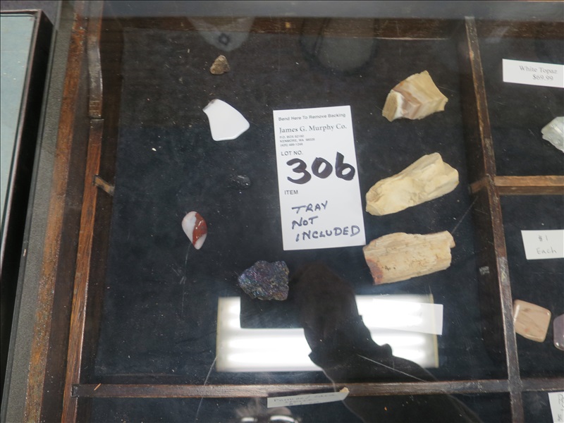 LOT, ASSORTED COLLECTABLE ROCKS IN TOP OF GLASS CASE (TRAY & CASE ARE NOT INCLUDED)