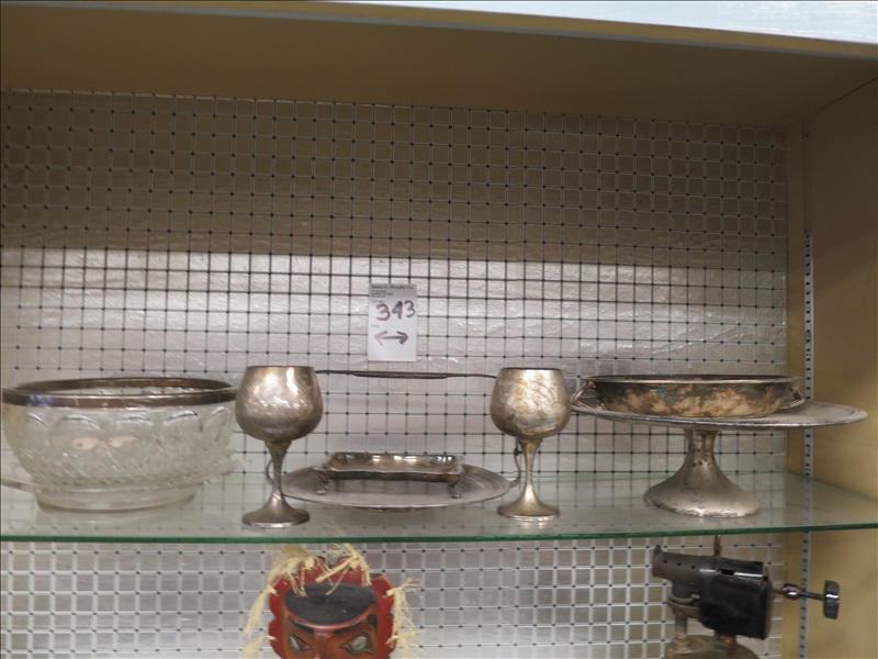 LOT, ASSORTED SILVER & GLASSWARE ON THIS SHELF
