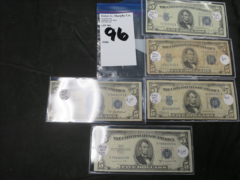 LOT, (5) ASSORTED $5 SILVER CERTIFICATES TO INCLUDE: (2) 1934-C, (1) 1934-D, (1) 1953-A & (1) 1953-B