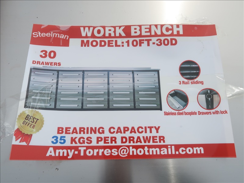 10' 30-DRAWER WORKBENCH, STAINLESS DRAWER (UNUSED)