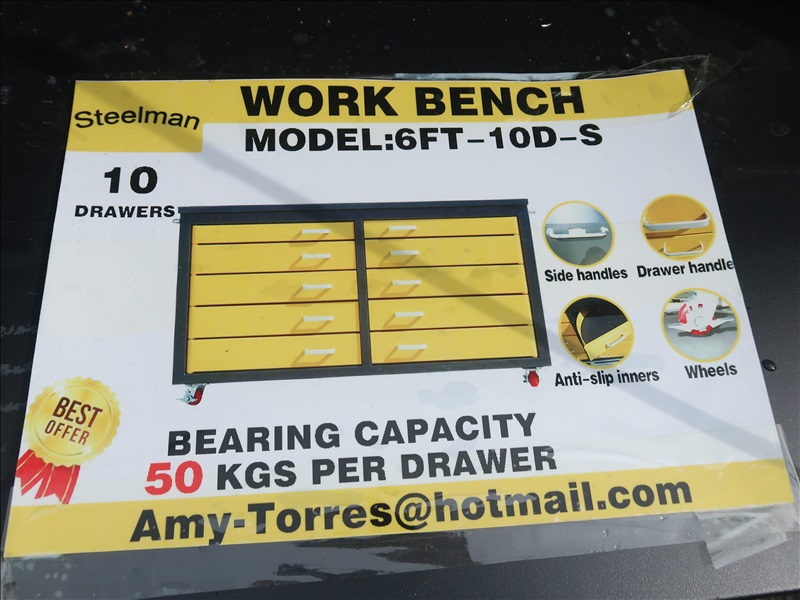 6' 10-DRAWER WORKBENCH, YELLOW DRAWERS (UNUSED)