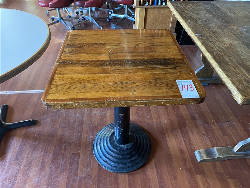 LOT, (3) 24" X 24" WOOD TOP SINGLE PEDESTAL TABLES (2 TABLES IN BASEMENT)
