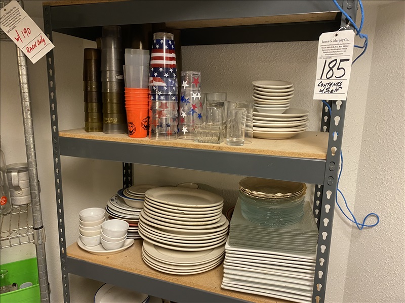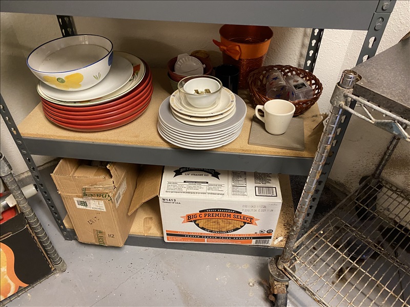 LOT, ASSORTED DISHWARE & MISC ON THIS SHELVING UNIT W/SHELVING