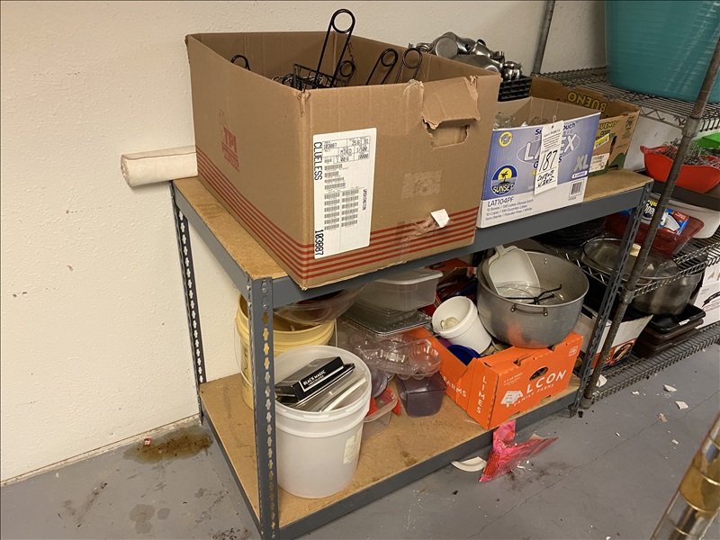 LOT, ASSORTED RESTAURANT SUPPLIES ON THIS SHELVING UNIT W/SHELVING