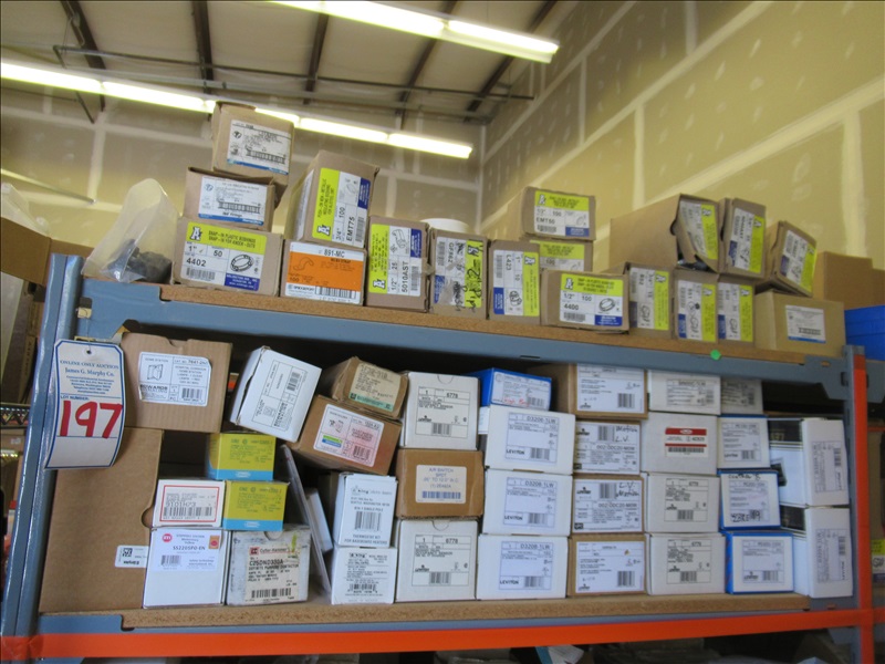 LOT, ASSORTED CABLE CONNECTORS, EMT BUSHINGS, LEVINGTON CONTROL DEVICES, MISC ALARM, MOTOR & HEATING CONTROL DEVICES ON THESE (2) SHELF SECTIONS