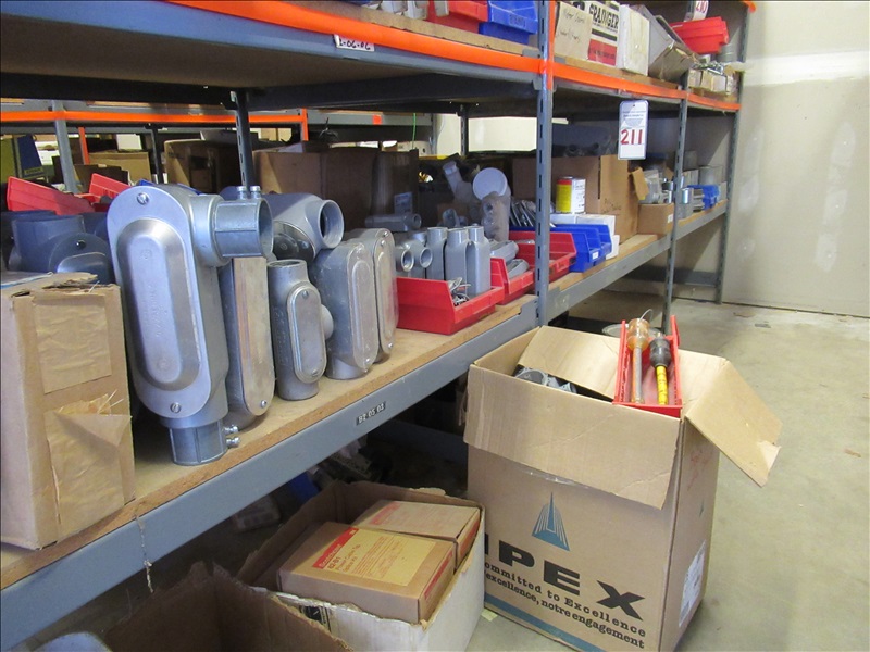 LOT, ASSORTED CONDUIT BODIES, FS BOXES, GRC COUPLERS & THREADLESS CONNECTORS ON THESE (5) SHELF SECTIONS