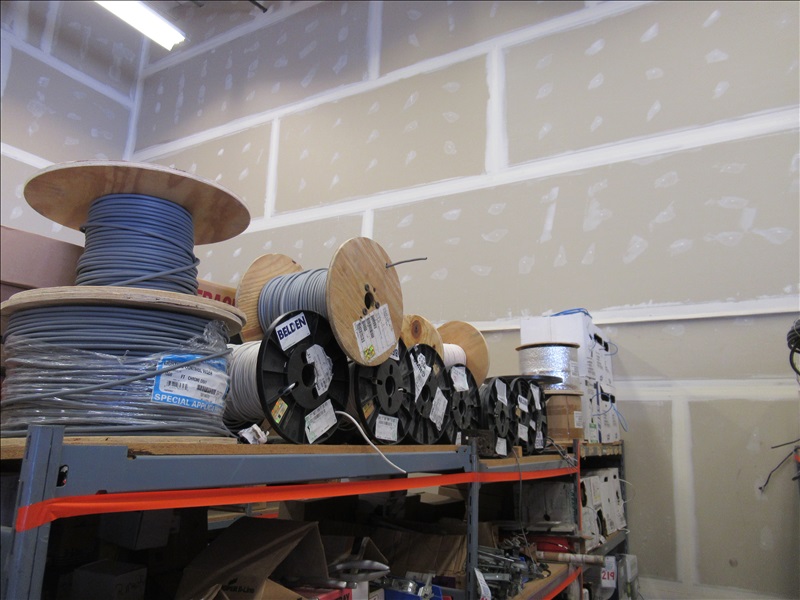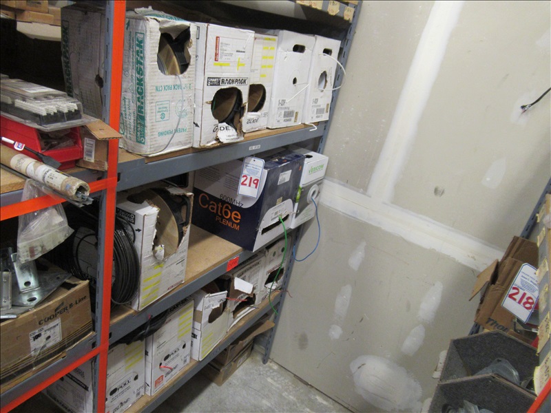 LOT, ASSORTED COM WIRE ON TOP OF THIS SHELF & ON THESE (4) SHELF SECTIONS