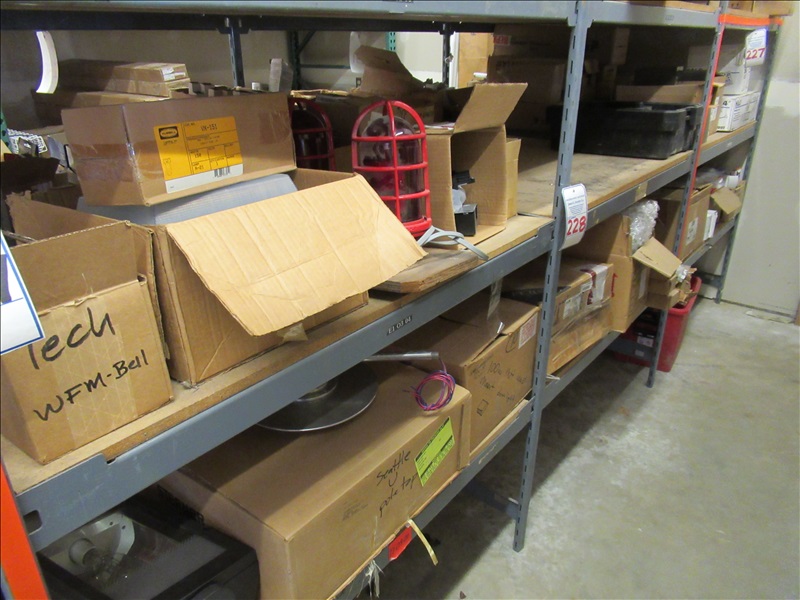 LOT, ASSORTED LIGHTING FIXTURES & ELECTRICAL SUPPLIES ON THESE (4) SHELF SECTIONS