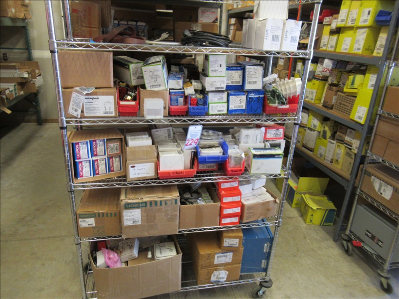 LOT, ASSORTED BREAKERS, OUTLETS & ELECTRICAL SUPPLIES ON THIS RACK