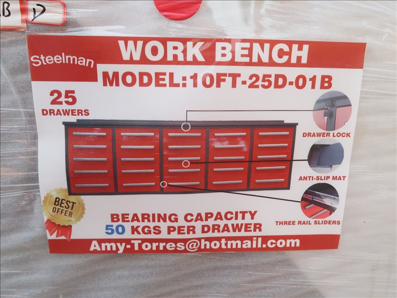 9'5"W 25-DRAWER METAL WORKBENCH (RED, UNUSED)