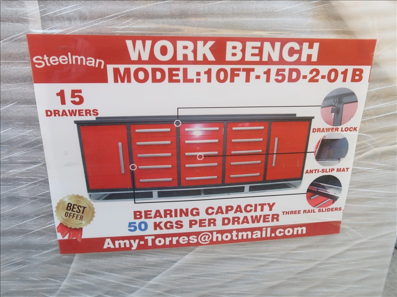 9'5"W 15-DRAWER, 2-CABINET METAL WORKBENCH (RED, UNUSED)