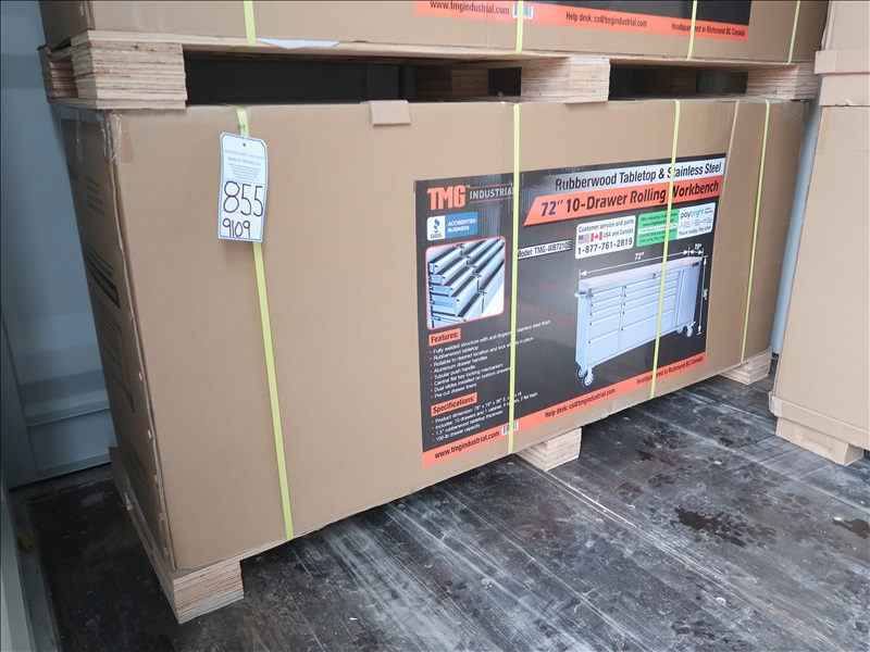 72" 10-DRAWER, SS SINGLE CABINET ROLLING WORKBENCH W/RUBBERWOOD TABLE TOP (UNUSED)