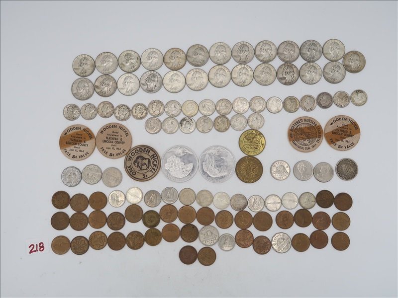 LOT, APPROX (25) 1964 & PRIOR QUARTERS, (6) MERCURY, (18) 1964 & PRIOR, & (1) 1965 DIMES, (58) FOREIGN COINS, & (9) TOKENS