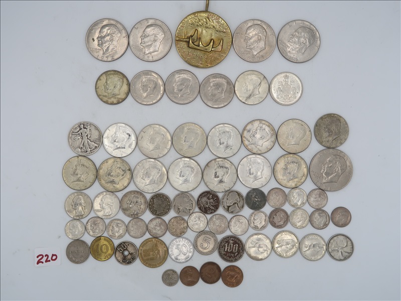 LOT, (5) IKE DOLLARS, (1) 1942 LIBERTY WALKING, & (6) KENNEDY HALF DOLLARS, (3) 1964 & PRIOR QUARTERS, (17) 1964 & PRIOR DIMES, (2) BUFFALO, (1) V, & (1) 1940 NICKELES, (1) STEELY PENNY, (16) FOREIGN COINS, & (1) PENDANT