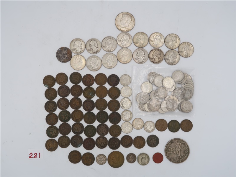 LOT, APPROX (1) KENNEDY HALF DOLLAR, (1) 1870 LIBERTY SEATED, & (15) 1964 & PRIOR QUARTERS, (62) 1964 & PRIOR DIMES, (39) INDIAN HEAD, & (3) WHEAT PENNIES, (7) FOREIGN COINS, & (1) TOKEN
