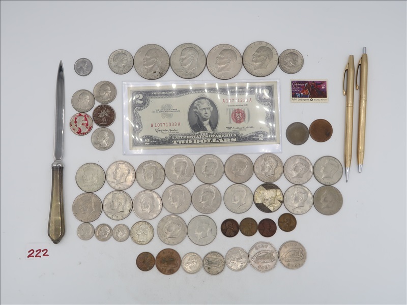 LOT, APPROX (4) IKE, & (2) SUSAN B ANTHONY DOLLARS, (20) KENNEDY HALF DOLLARS, (1) 1964, (3) 1965-69, & (2) BICENTIANNIAL QUARTERS, (3) 1965-69 DIMES, (4) WHEAT & (1) STEEL PENNIES, (7) FOREIGN COINS, (1) $2 1963 US NOTE WITH A RED SEAL, (1) US STAMP, & (