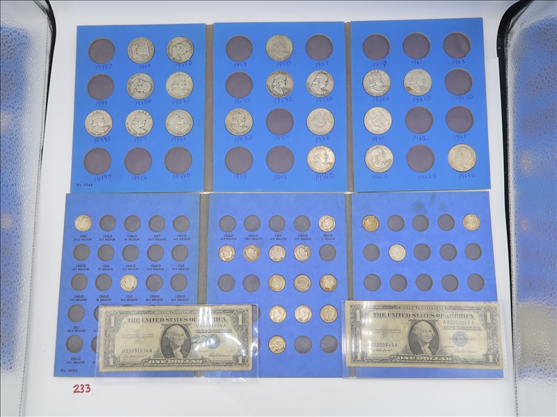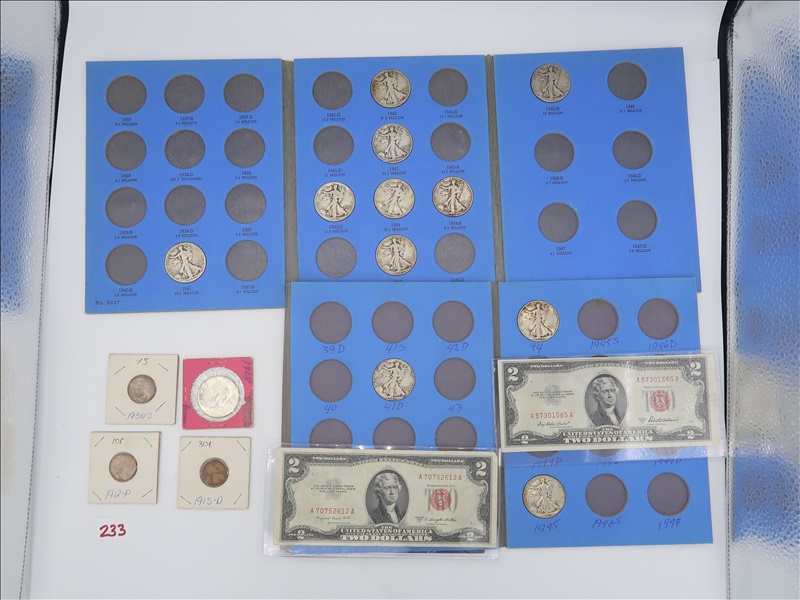 LOT, (11) LIBERTY STANDING, (18) FRANKLIN, & (1) KENNEDY HALF DOLLARS, (17) ROOSEVELT DIMES, (3) WHEAT PENNIES, (2) $2 US NOTES W/RED SEALS, (2) $1 SILVER CERTIFICATES