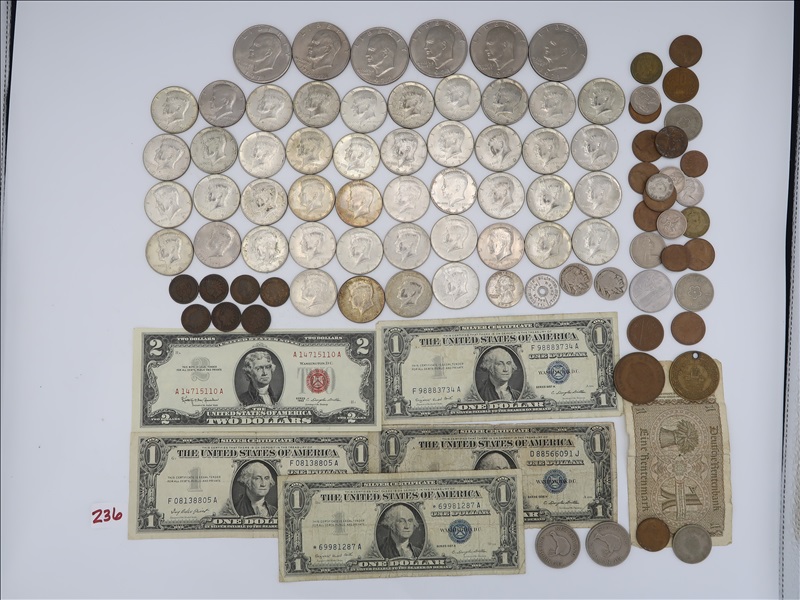 LOT, APPROX (6) IKE DOLLARS, (44) KENNEDY HALF DOLLARS, (1) 1964 & PRIOR QUARTER, (2) BUFFALO NICKELS (7) INDIAN HEAD PENNIES, (31) FOREIGN COINS, (1) TOKEN, (1) $2 US NOTE W/RED SEAL, (4) $1 SILVER CERTIFICATES, & (1) FOREIGN CURRENCY