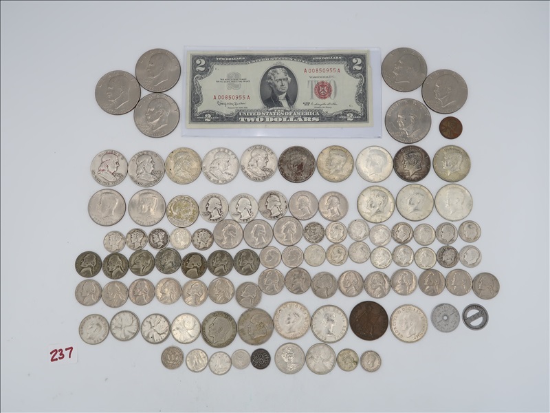 LOT, APPROX (6) BICENTENNIAL IKE, & (1) SUSAN B ANTHONY DOLLARS, (5) FRANKLIN, & (10) KENEDY HALF DOLLARS, (3) 1964 & PRIOR, & (5) BICENTENNIAL QUARTERS, (5 MERCURY, (16) 1964 & PRIOR, & (2) 1965-69 DIMES, (7) WAR, & (16) 1964 & PRIOR NICKELES, (1) WHEAT