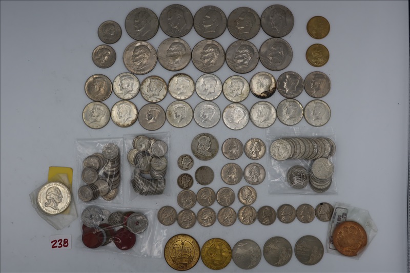 LOT, APPROX, (10) IKE, (2) SUSAN B ANTHONY, & (2) SACAGAWEA DOLLARS, (1) FRANKLIN, & (18) KENNEDY HALF DOLLARS, (24) 1964 & PRIOR, (2) 1965-69, & (2) BICENTENNIAL QUARTERS, (2) MERCURY, (51) 1964 & PRIOR, & (26) 1965-69 DIMES, (1) V, & (19) 1964 & PRIOR N