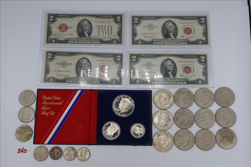 LOT, APPROX (12 IKE, (1) SUSAN B ANTHONY DOLLARS, (3) KENNEDY HALF DOLLARS, (1) 1925 LIBERTY STANDING, & (2) BICENTENNIAL QUARTERS, (1) US BICENTENIAL SILVER PROOF SET, & (4) $2 US NOTES W/RED SEALS