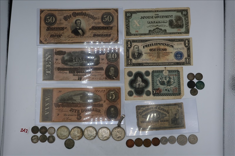 LOT, (5) KENNEDY HALF DOLLARS, (3) ASSORTED CONFEDERATE CURRENCY, (12) DAMAGED COINS, (8) FOREIGN COINS, (4)FOREIGN CURRENCY
