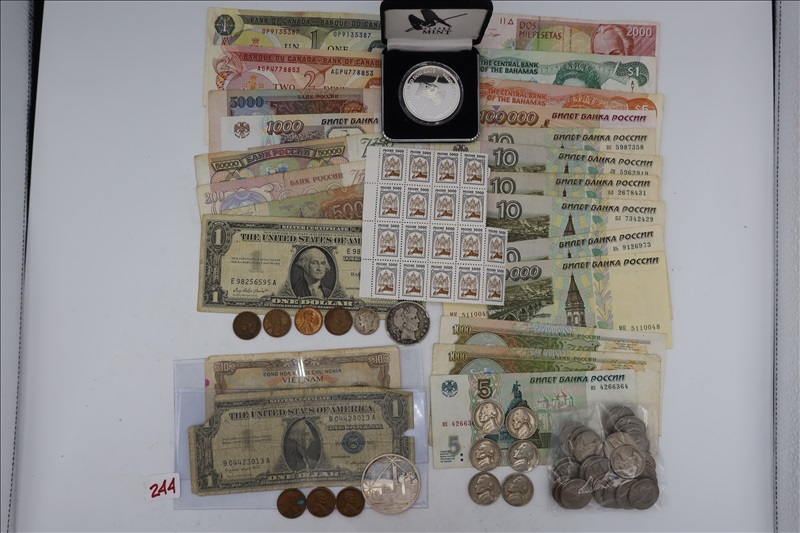 LOT, APPROX (1) 1908 BARBER HALF DOLLAR, (1) MERCURY DIME, (1) INDIAN HEAD, & (6) WHEAT PENNIES, (2) COMMEMORATIVE COINS, (2) $1 1957 SILVER CERTIFICATES, ASSORTED FOREIGN CURRENCY, & (18) FOREIGN STAMPS