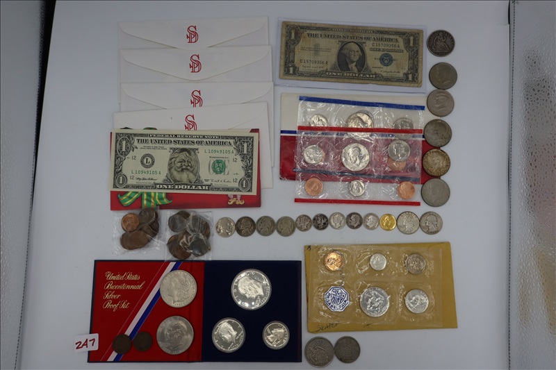 LOT, APPROX (1) 1921 MORGAN SILVER DOLLAR, (1) IKE DOLLAR, (1) 1872 LIBERTY SEATED, & (5) KENNEDY HALF DOLLARS, (2) 1964 & PRIOR QUARTERS, (3) MERCURY, (2) 1964 & PRIOR, & (1) COLORIZED DIMES, (1) BUFFALO, (1) WAR, & (2) 1964 & PRIOR NICKELS, (2) INDIAN H