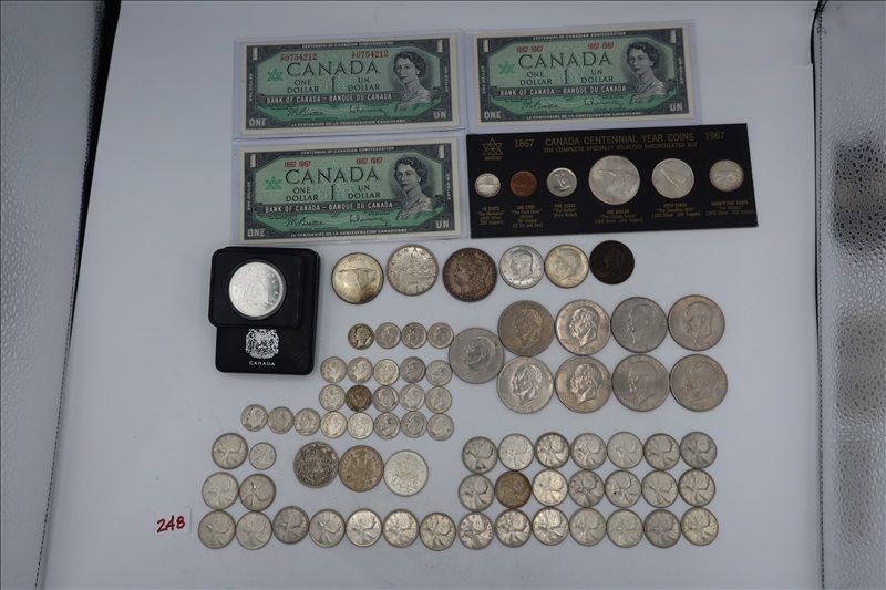 LOT, APPROX (1) 1886 MORGAN, SILVER DOLLER, (9) IKE DOLLARS, (2) KENNEDY HALF DOLLARS, (1) MERCURY, (18) 1964 & PRIOR, & (3) 1965-69 DIMES, (38) FOREIGN COINS, (1) LIBRARY OF PARLAMENT $1 CANADIAN COIN, (1) 1867 CANADA CENTENNIAL 6 COIN SET, & (3) CANADIA