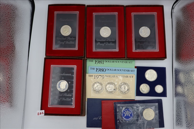 LOT, (4) IKE SILVER DOLLAR PROOFS YEARS 1971 TO 1974, (2) IKE UNCIRCULATED SILVER DOLLAR COINS (1971 & 1973), (3) SUSAN B ANTHONY DOLLAR SOUVENIR SETS (3 COINS EACH) (1979 TO 1981), (1) US BICENTENNIAL SILVER UNCIRCULATED SET 1776-1976 (3 COIN SET), (1) U
