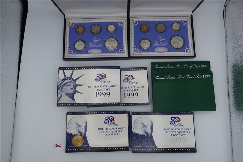 LOT, (1) 1935 YEAR TO REMEMBER COMMEMORATIVE MINT SET, (1) 1939 YEAR TO REMEMBER COMMEMORATIVE MINT SET, (2) 1997 US PROOF SET, (2) 1999 US PROOF SET, (2) 1999 MINT QUARTERS PROOF SET, (1) SACAGAWEA DOLLAR