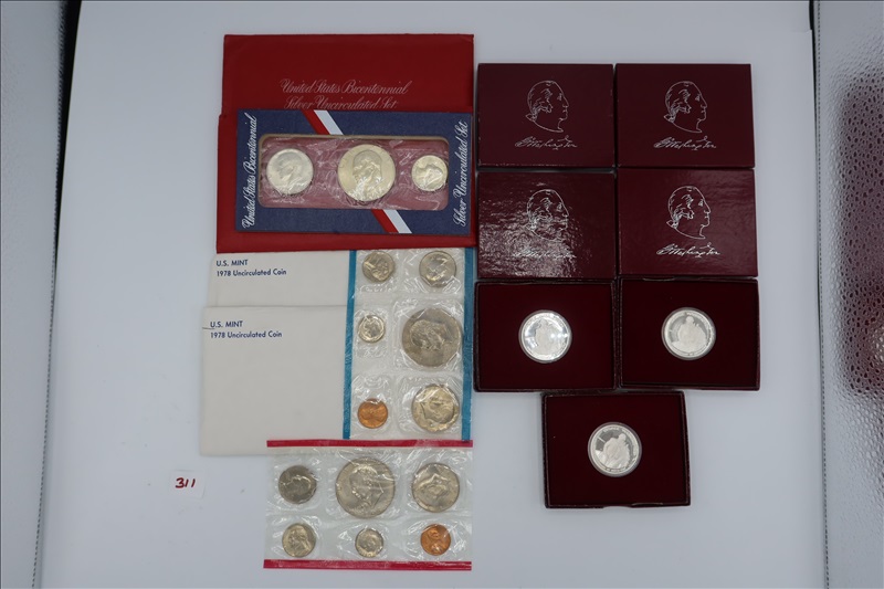 LOT, (2) US BICENTENNIAL SILVER UNCIRCULATED SET 1776-1976, (2) 1978 MINT SETS, & (7) GEORGE WASHINGTON 90% SILVER COMMEMORATIVE HALF DOLLARS
