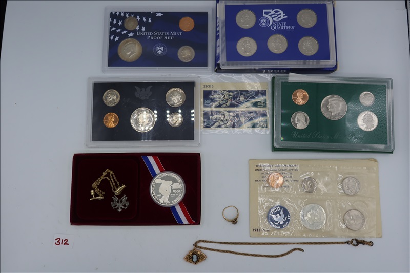 LOT, (1) 1983 OLYMPIC SILVER DOLLAR, (Q1) 1965 MINT SET, (1) 1971 PROOF SET, (1) 1996 PROOF SET, (1) 1999 PROOF SET, US STAMPS, (1) RING, (1) NECKLACE, & (1) CUFFLINK