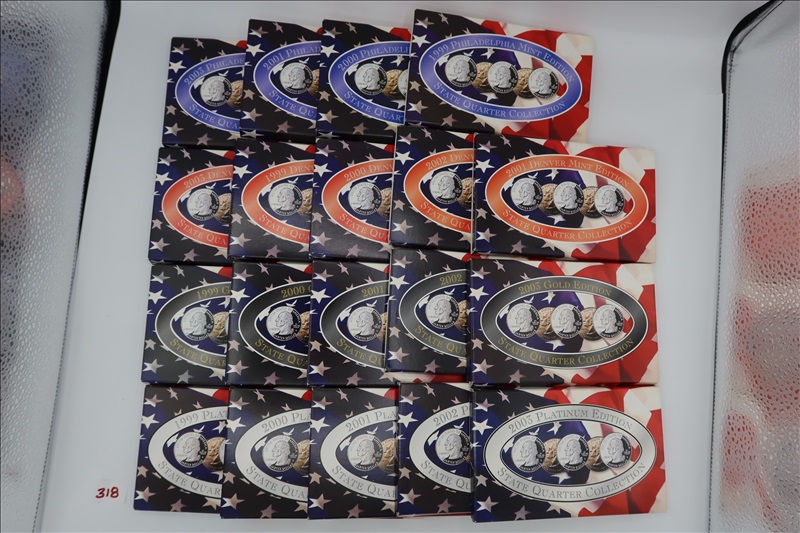 LOT, (4) 1999-2001 & 2003 PHILADELPHIA MINT EDITION STATE QUARTER COLLECTION, (5) 1999-2003 DENVER MINT EDITION STATE QUARTER COLLECTION, (5) 1999-2002 GOLD EDITION STATE QUARTER COLLECTION, & (5) 1999-2003 PLATINUM EDITION STATE QUARTER COLLECTION
