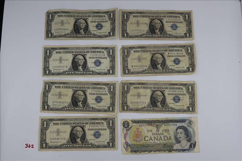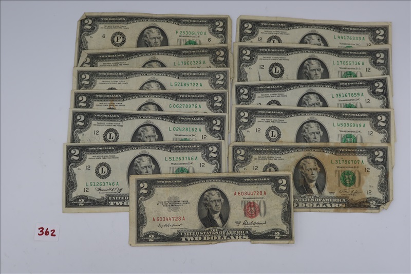 LOT, (1) 1953 $2 US NOTE W/RED SEAL, (11) $2 US NOTES, (7) $1 SILVER CERTIFICATES & (1) FOREIGN CURRENCY
