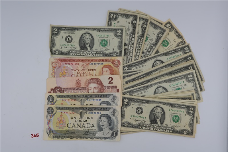 LOT, (44) $2 US NOTES, (1) $2 US NOTE (STAR NOTE) & ASSORTED FOREIGN CURRENCY