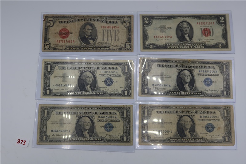 LOT, (1) $5 US NOTE W/RED SEAL, (1) $2 US NOTE W/RED SEAL & (4) $1 SILVER CERTIFICATES
