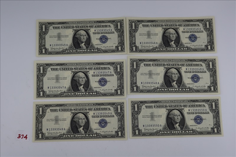 LOT, (5) $1 SILVER CERTIFICATES SEQUENTIAL SERIAL NUMBERS