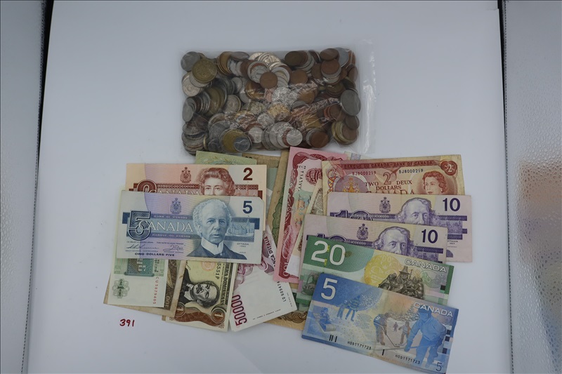 LOT, APPROX (406) FOREIGN COINS & ASSORTED FOREIGN CURRENCY