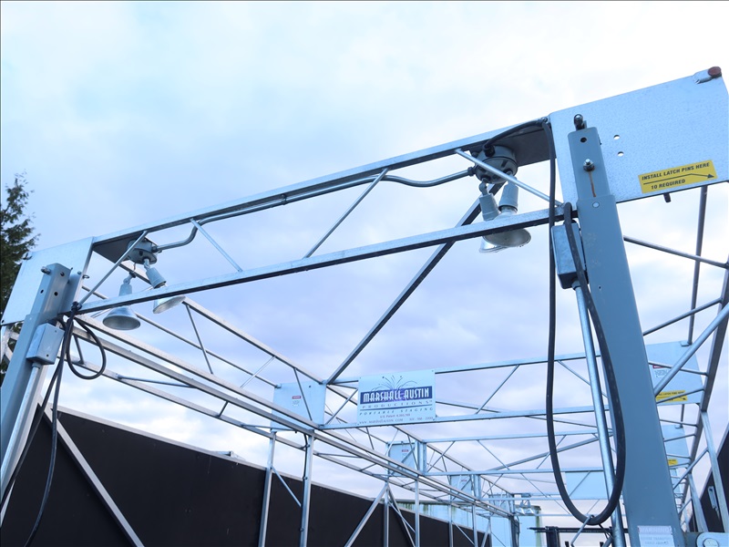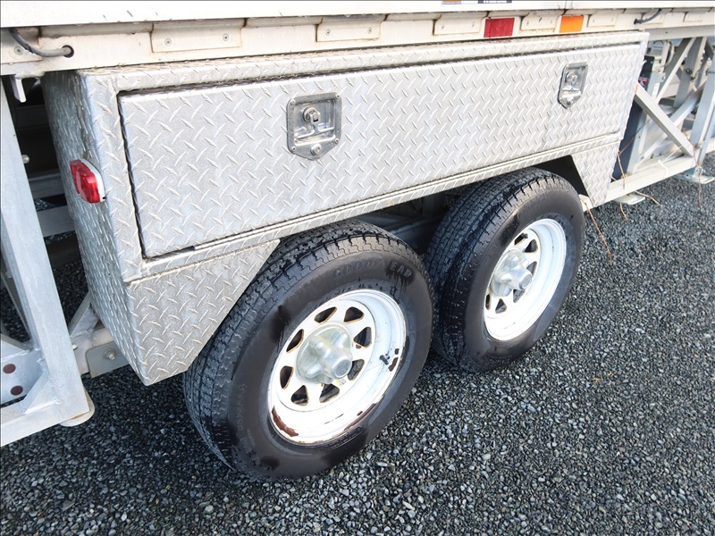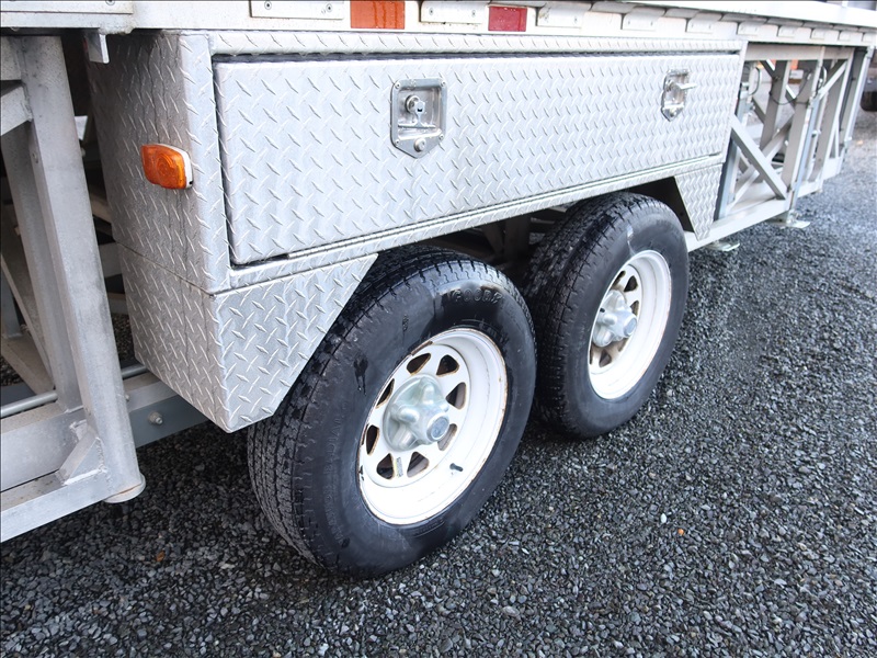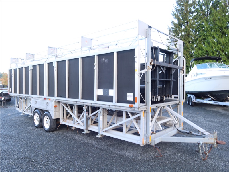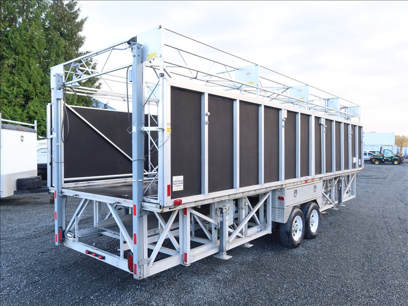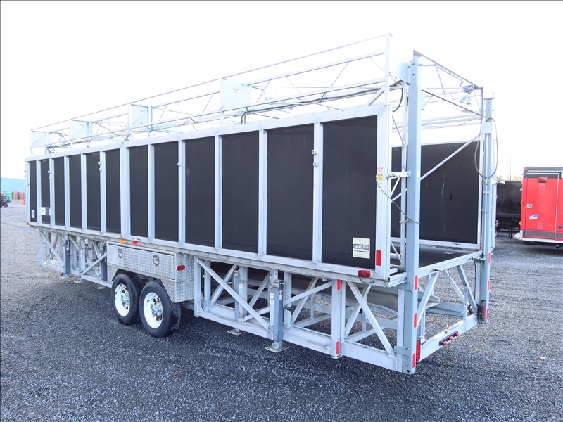 T/A, 24' X 8'4" ALUMINUM PORTABLE STAGING TRAILER, 7'10" CENTER STAGE & (2) FOLD DOWN SIDES (TOTAL STAGE AREA APPROX 24' X 16'), RAMP, STAIRS, STABILIZER JACKS, ELECT BRAKES, 205/75R15