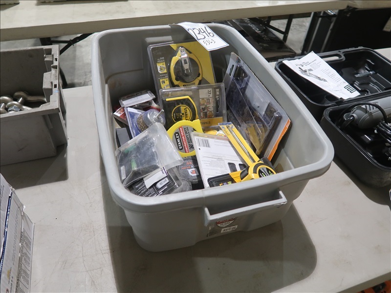 LOT, MISC TOOLS, TAPE MEASURES, CHALK LINE & ASSORTED TOOLS IN THIS TUB (UNUSED)