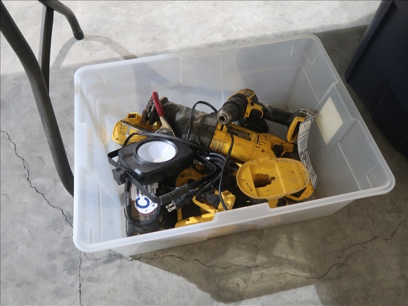 LOT, ASSORTED CORDLESS 18V TOOLS, BATTERIES & CHARGER IN THIS TUB
