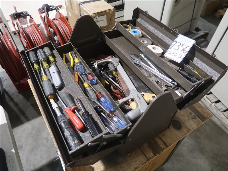 LOT, TOOLBOX W/CONTENTS & WOODEN CABINET ON CASTERS