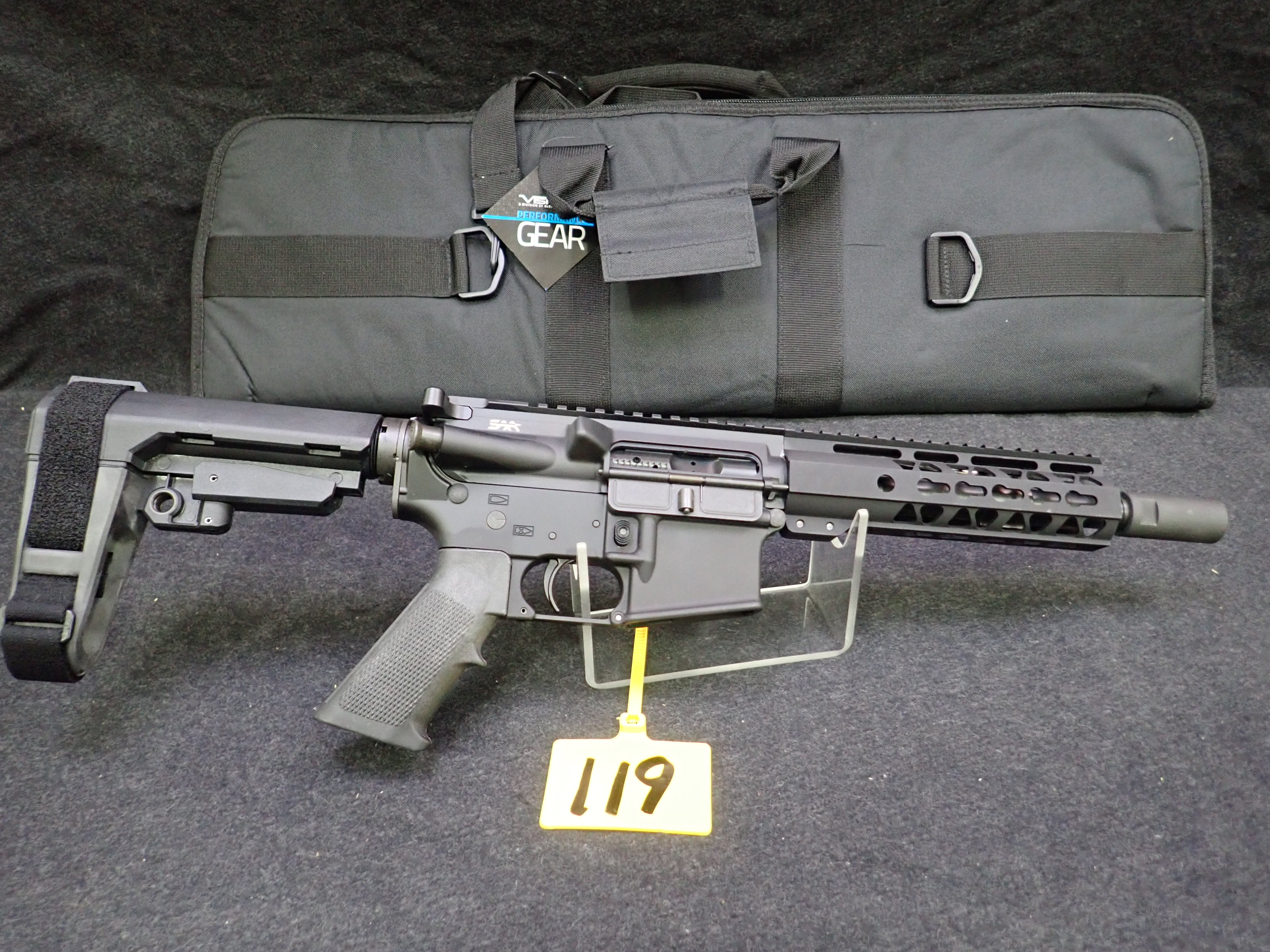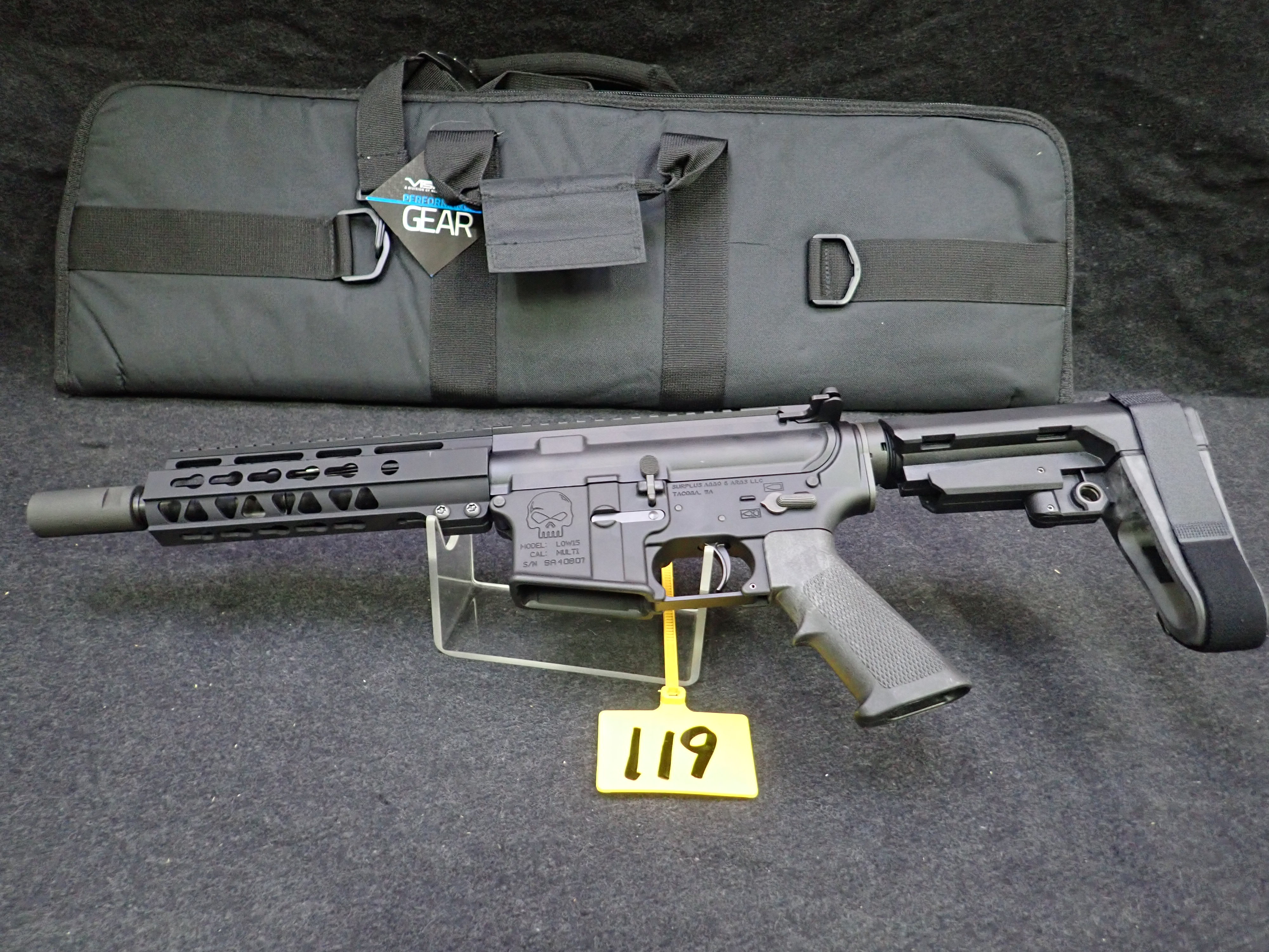 300 BLACKOUT SEMI-AUTOMATIC PISTOL, 8" BARREL, SBA3 PISTOL BRACE, "SKULL" ENGRAVED W/SOFT CASE (UNUSED, THIS FIREARM ALSO REQUIRES AN 11% FEDERAL EXCISE TAX)