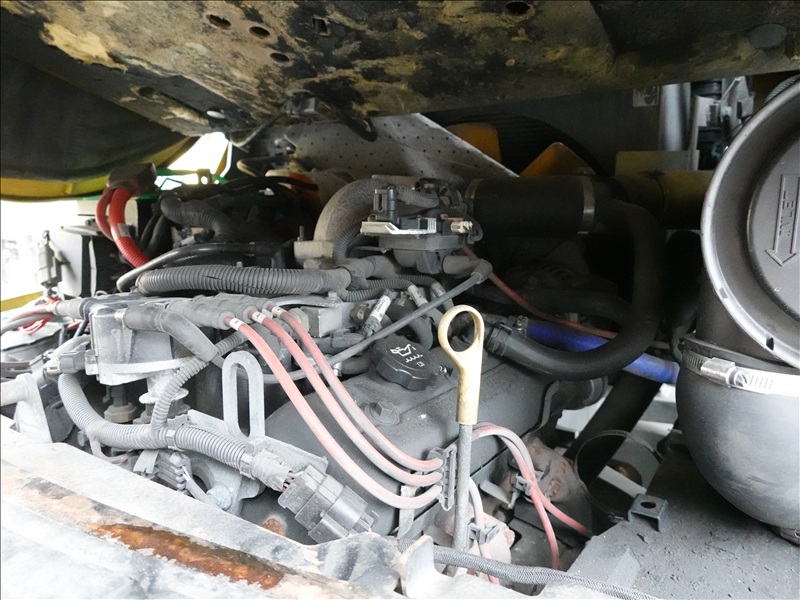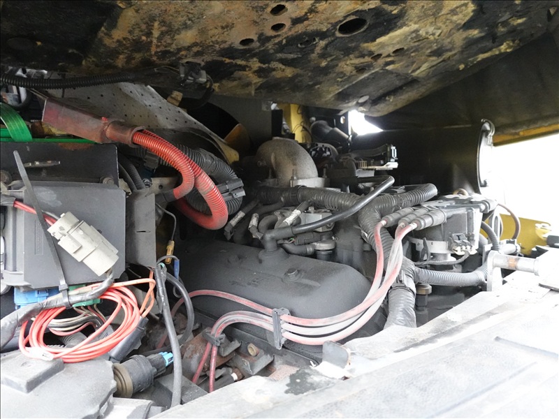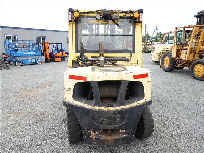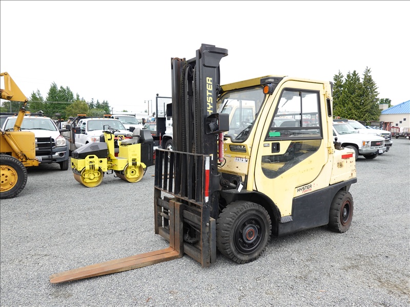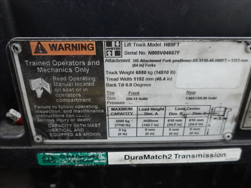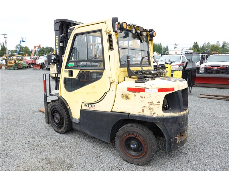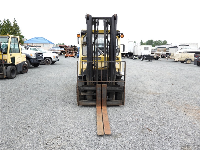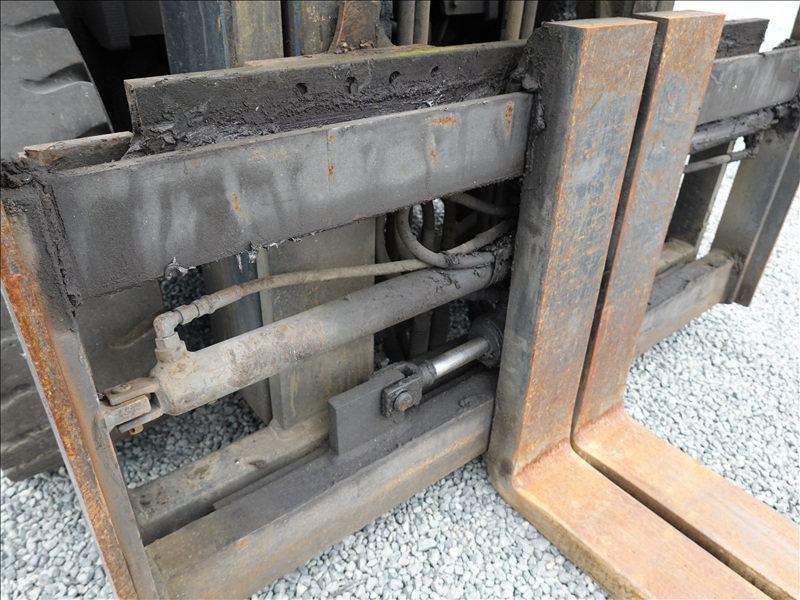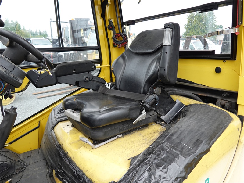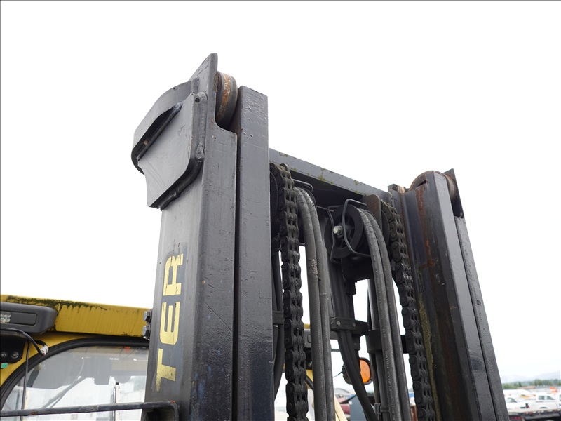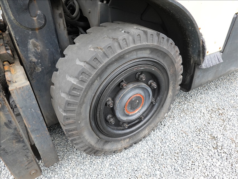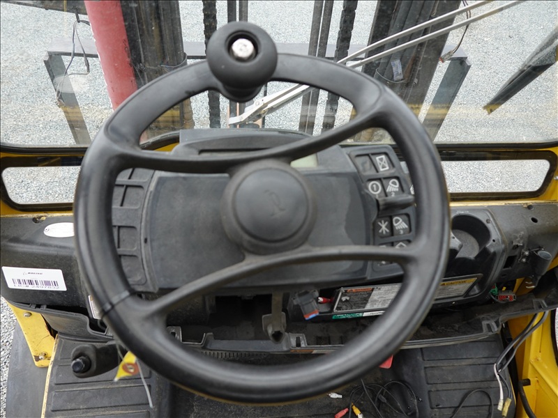 7,700 LB SOLID TIRE FORKLIFT, 143.7" FORK HEIGHT, 2-STAGE MAST, SIDE SHIFT, FORK POSITIONER, FTC, 6 CYL LPG, CAB, TOW HITCH (MISSING PART, NO KEY, NO PROPANE TANK)