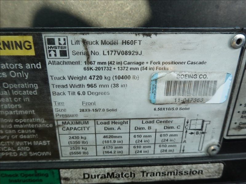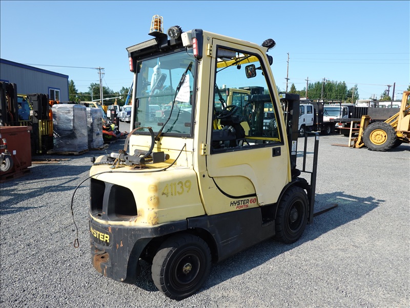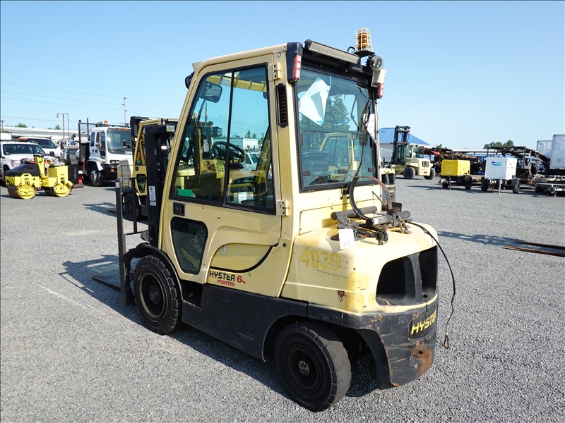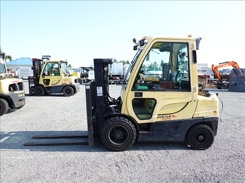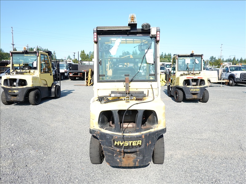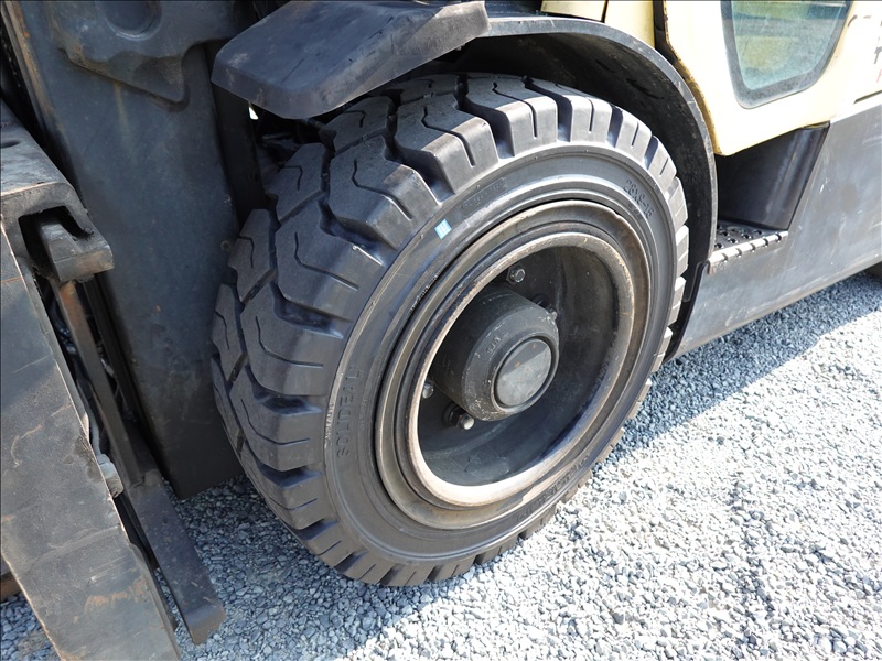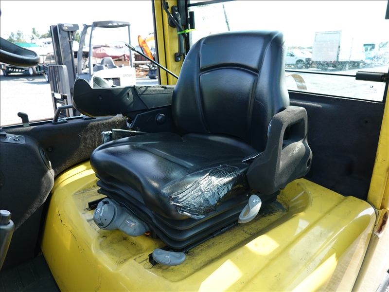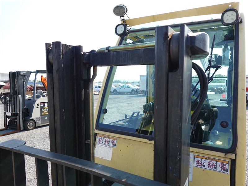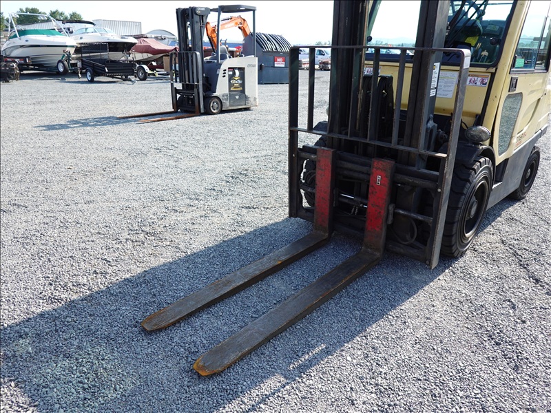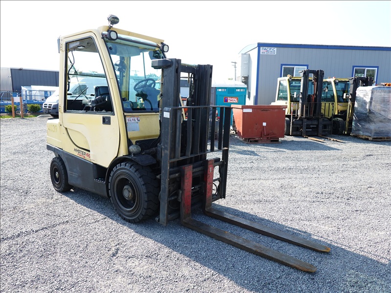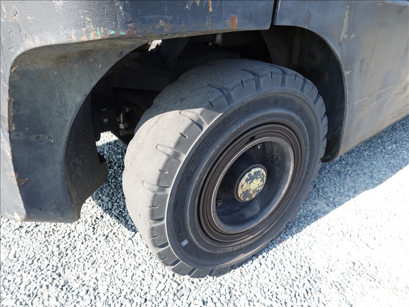 5,350 LB SOLID TIRE FORK LIFT, 2-STAGE MAST, SIDE SHIFT, FORK POSITIONER, FTC, 4 CYL LPG, CAB (NO PROPANE TANK, FUEL SYSTEM ISSUE, STARTS & DIES WHEN PRIMED)
