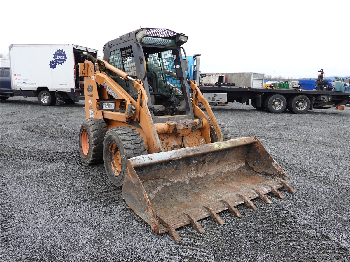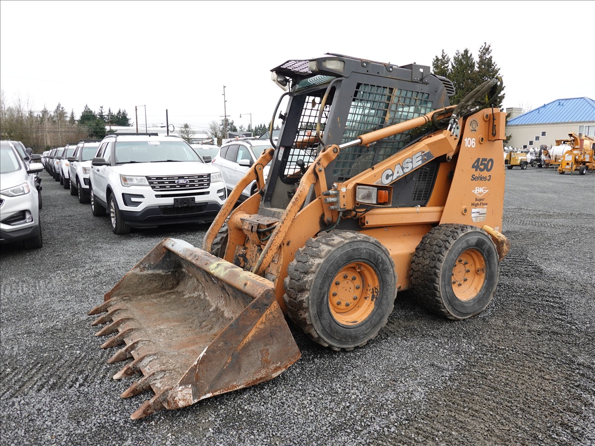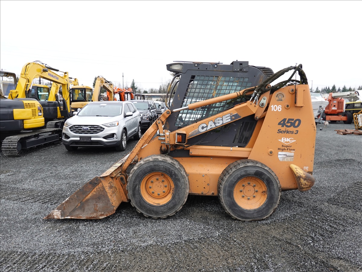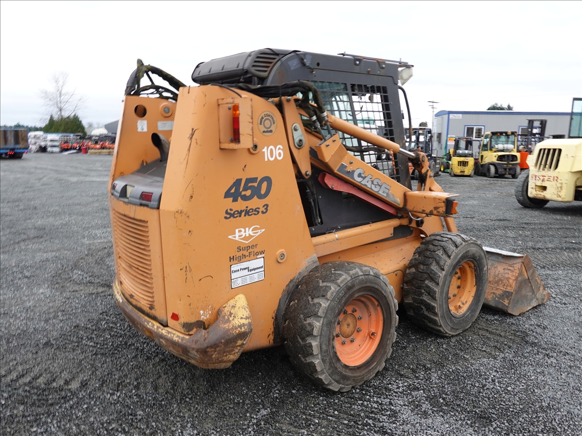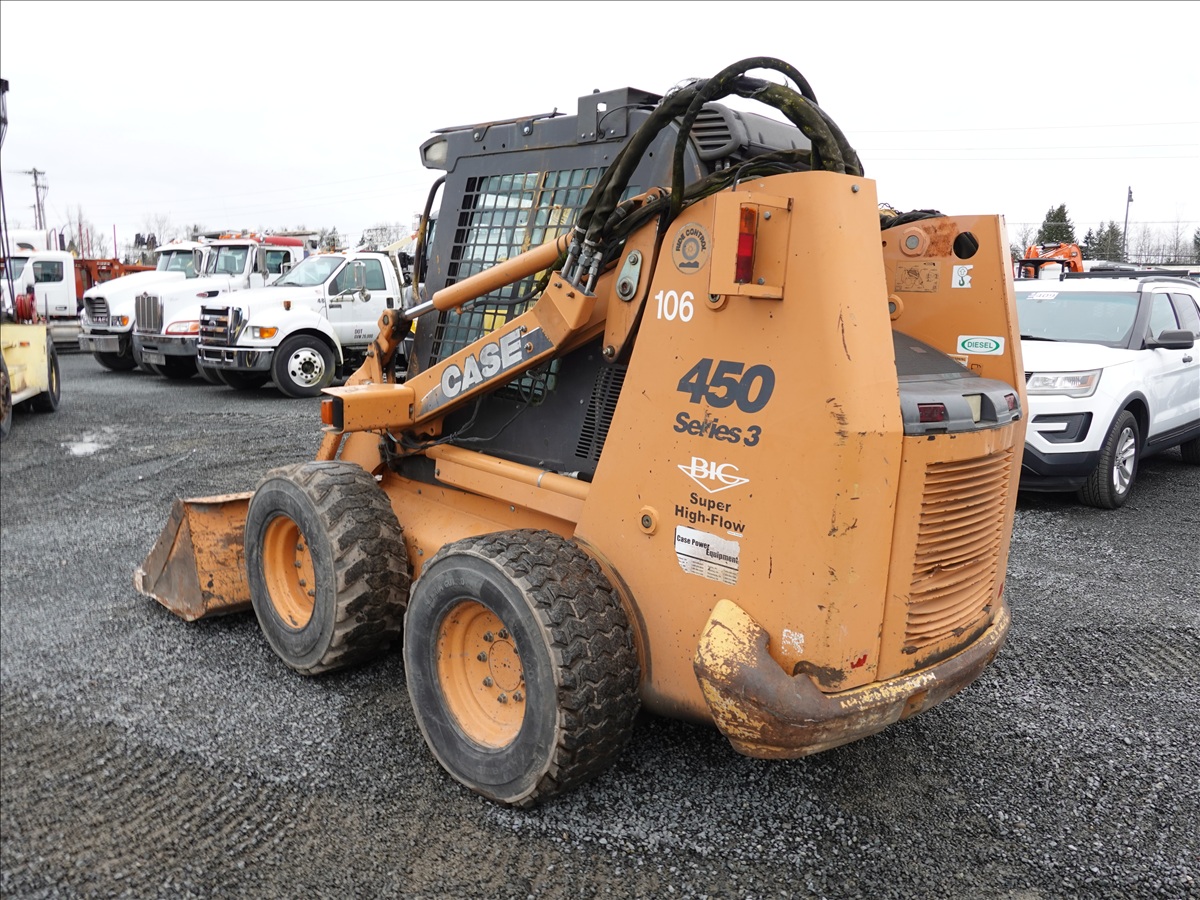 SKID STEEER LOADER, 89.9 HP 445/M3, QC 83" BUCKET, HYD COUPLER, HIGHFLOW AUX HYD, ELECTRICS, A/C CAB (**MISSING DOOR/GLASS, REAR AXLE DAMAGED, SEE PHOTO**)