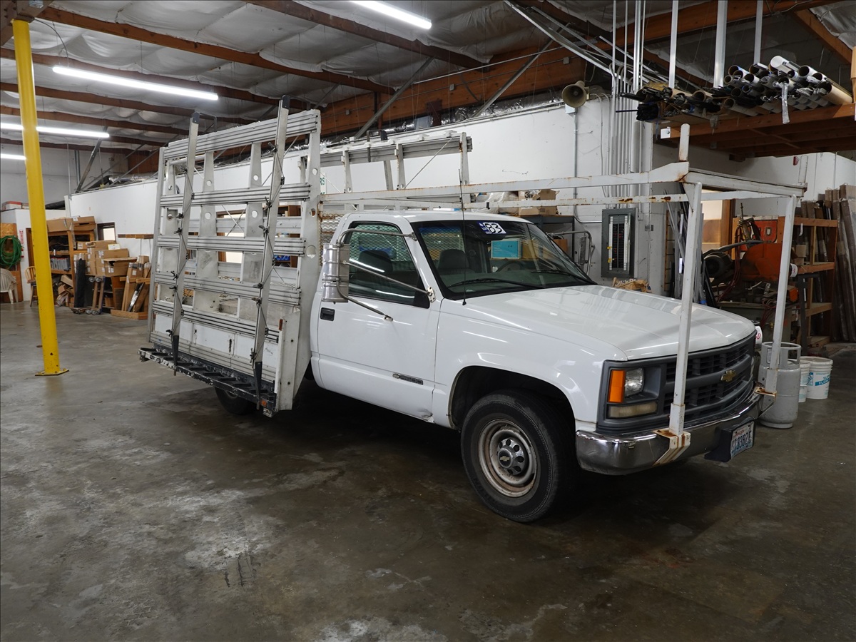 9' GLASS TRUCK, V8, AUTO, GAS, A/C, ODOMETER READS: 179,054 (CRACKED WINDSHIELD, INTERIOR DOOR HANDLE BROKE)